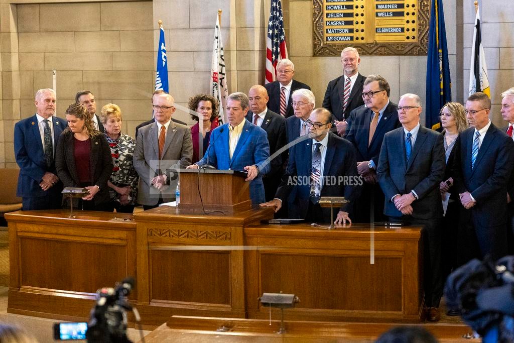 Gov. Jim Pillen is joined by republican state senators as he announces that the state will participate in the Summer Electronic Benefits Transfer Program after previously saying Nebraska wouldn't take part during a press conference in the Warner Chamber at the Capitol, Monday, Feb. 12, 2024, in Lincoln, Neb. (Kenneth Ferriera/Lincoln Journal Star via AP)