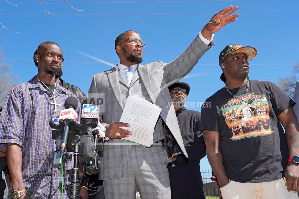 Michael Corey Jenkins, left, and Eddie Terrell Parker, right, stand with lead attorney Malik Shabazz, as they call on a federal judge Monday, March 18, 2024, at a news conference in Jackson, Miss., to impose the harshest possible penalties against six former Mississippi Rankin County law enforcement officers who committed numerous acts of racially motivated, violent torture on them in 2023. The six former law officers pleaded guilty to a number of charges for torturing them. (AP Photo/Rogelio V. Solis)