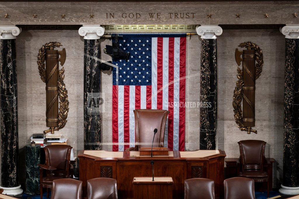 FILE - The speaker's dais is seen in the House of Representatives of the Capitol in Washington, Feb. 28, 2022. After House Speaker Kevin McCarthy was voted out of the job by a contingent of hard-right conservatives this week, House GOP leaders are now grappling to find a new speaker. With no speaker of the House, a constitutional officer second in line to the presidency, the Congress cannot fully function — to pass laws, fund the government and otherwise serve as the branch of government closest to the people — during a time of simmering uncertainty at home and abroad. (AP Photo/J. Scott Applewhite, File)