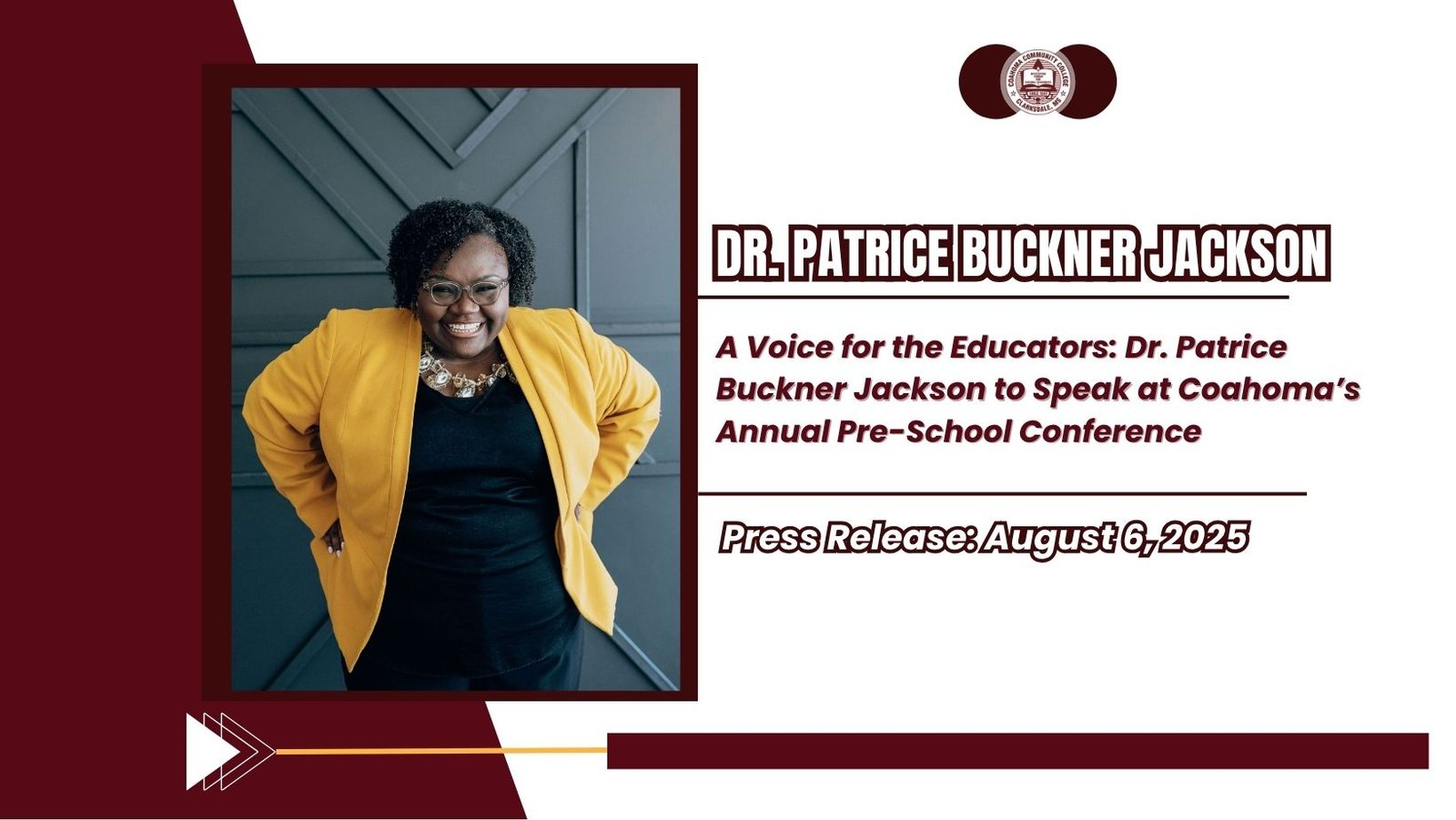(Clarksdale, Mississippi) — Coahoma Community College is excited to welcome Dr. Patrice Buckner Jackson, known as Dr. PBJ, as the keynote speaker for its annual Pre-School Conference. This much-anticipated event is designed to uplift and re-energize local educators ahead of the new academic year.