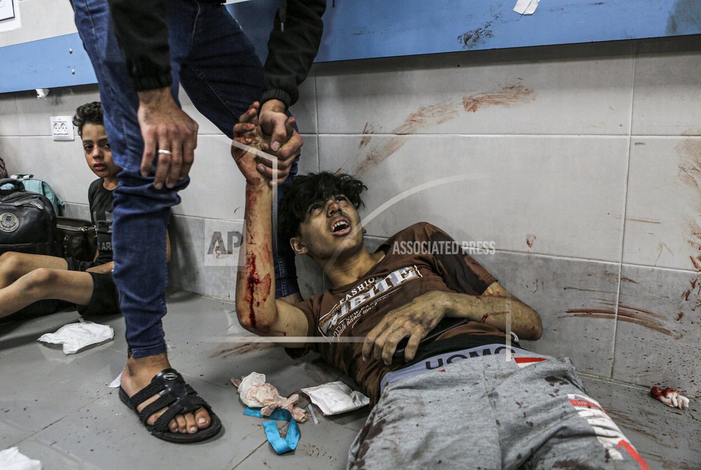 Wounded Palestinians lay on the floor at al-Shifa hospital, following Israeli airstrikes, in Gaza City, central Gaza Strip, Tuesday, Oct. 17, 2023. (AP Photo/Abed Khaled)