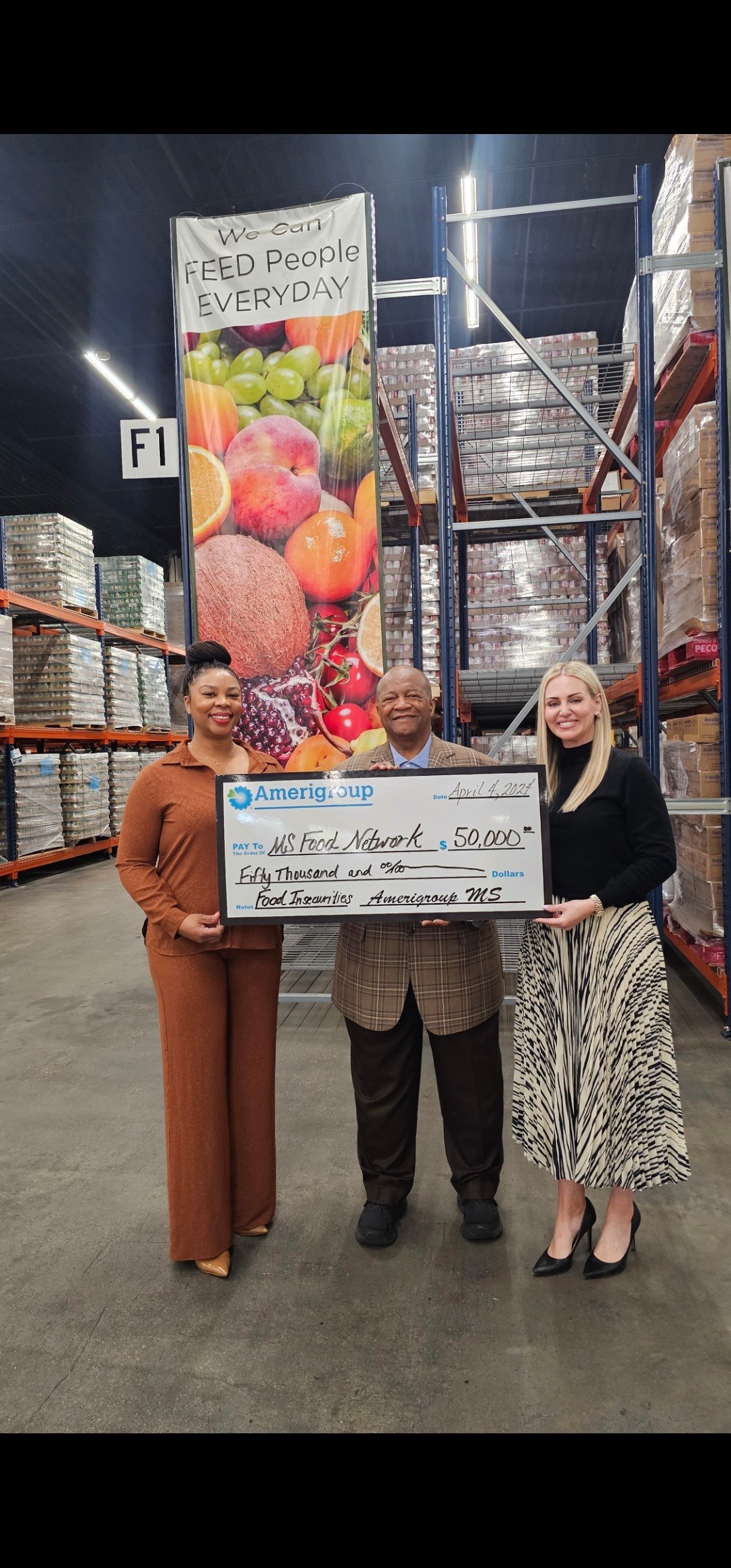 Jackson, MS (April 8, 2024) — On April 4, 2024, Amerigroup MS donated $50,000 to the Mississippi Food Network.  This generous donation will provide nutritious and balanced food options for students and their families during school closures.  This donation will directly support over 1000 families currently facing food insecurity in Sunflower and Forest counties.