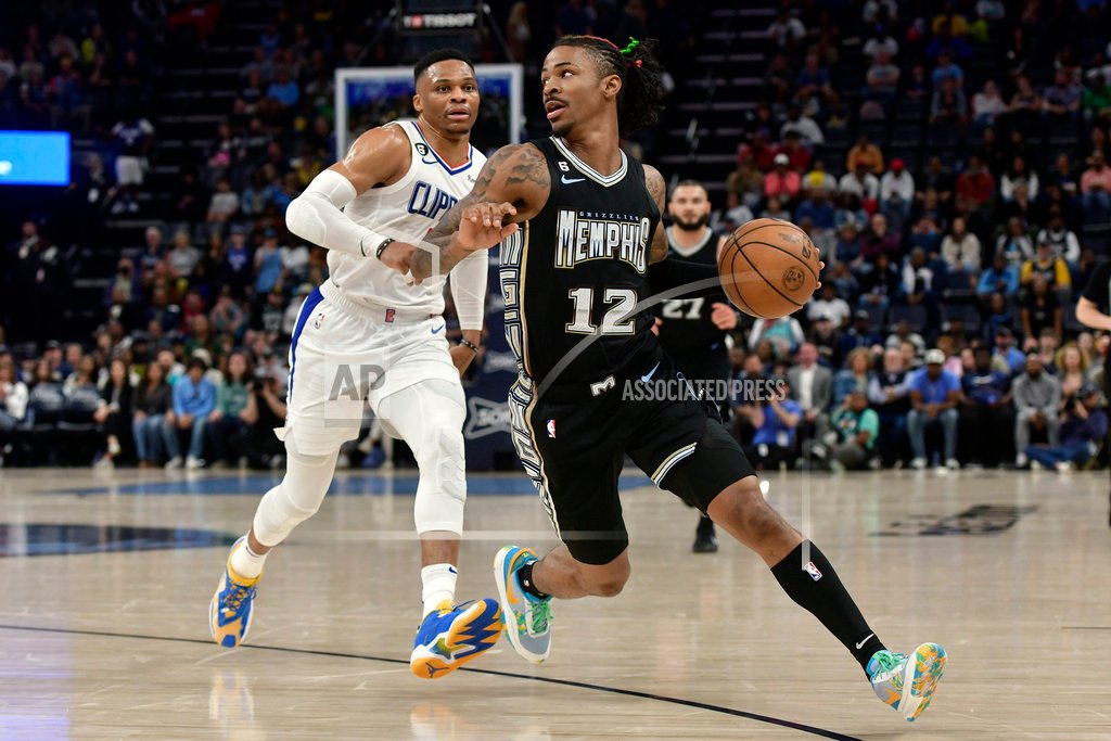 (AP Photo/Brandon Dill): Memphis Grizzlies guard Ja Morant, right, shoots against Los Angeles Clippers guard Russell Westbrook (0) in the first half of an NBA basketball game Friday, March 31, 2023, in Memphis, Tenn.
