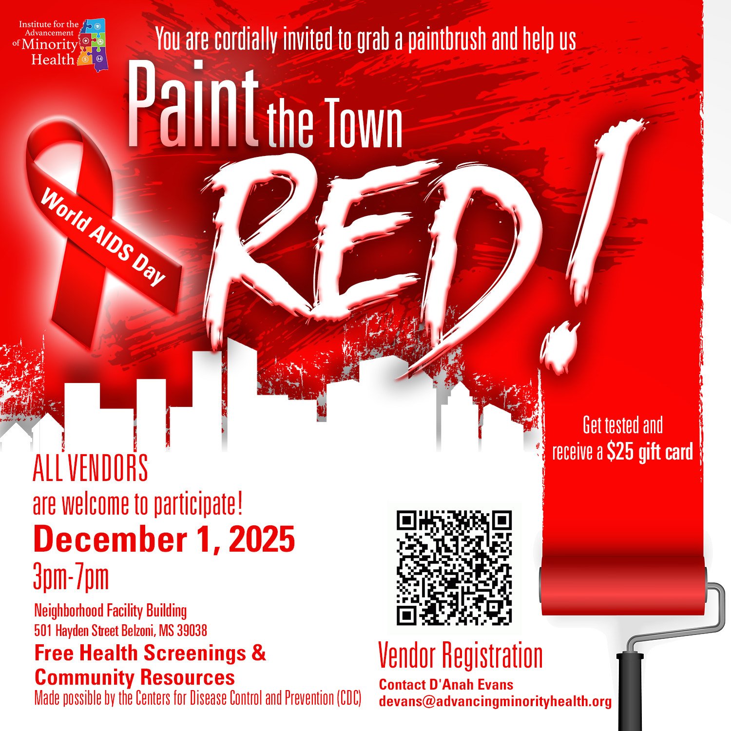 (Jackson, MS) November 18, 2025 — Belzoni residents will Paint the Town Red in observance of World AIDS Day.  From 3 p.m. to 7 p.m. on Monday, December 1, 2025, a community health fair will be held at the Neighborhood Facility Building, located at 50 Hayden Street in Belzoni, Mississippi.