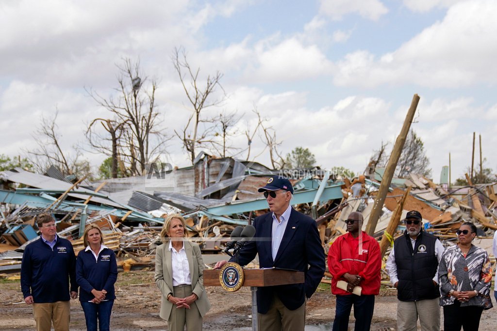 Photo: President Joe Biden speaks after surveying the damage in Rolling Fork, Miss., Friday, March 31, 2023, after a deadly tornado and severe storm moved through the area. From left, Mississippi Gov. Tate Reeves and his wife Elee Reeves, first lady Jill Biden, Biden, Rolling Fork Mayor Eldridge Walker, Rep. Bennie Thompson, D-Miss., and Housing and Urban Development Secretary Marcia Fudge. (AP Photo/Carolyn Kaster)