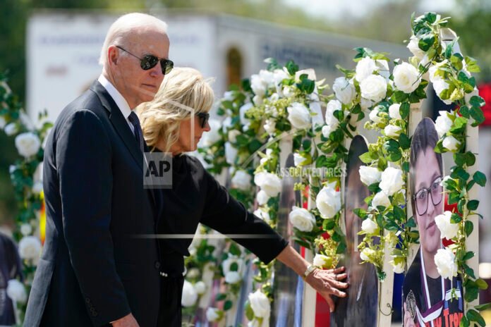 Cover Photo: President Joe Biden and first lady Jill Biden visit a memorial at Robb Elementary School to pay their respects to the victims of the mass shooting, May 29, 2022, in Uvalde, Texas. Biden will speak at a summit in Connecticut on Friday, June 16, 2023, to mark the first anniversary of a gun safety law signed after the school massacre in Uvalde, Texas. (AP Photo/Evan Vucci)