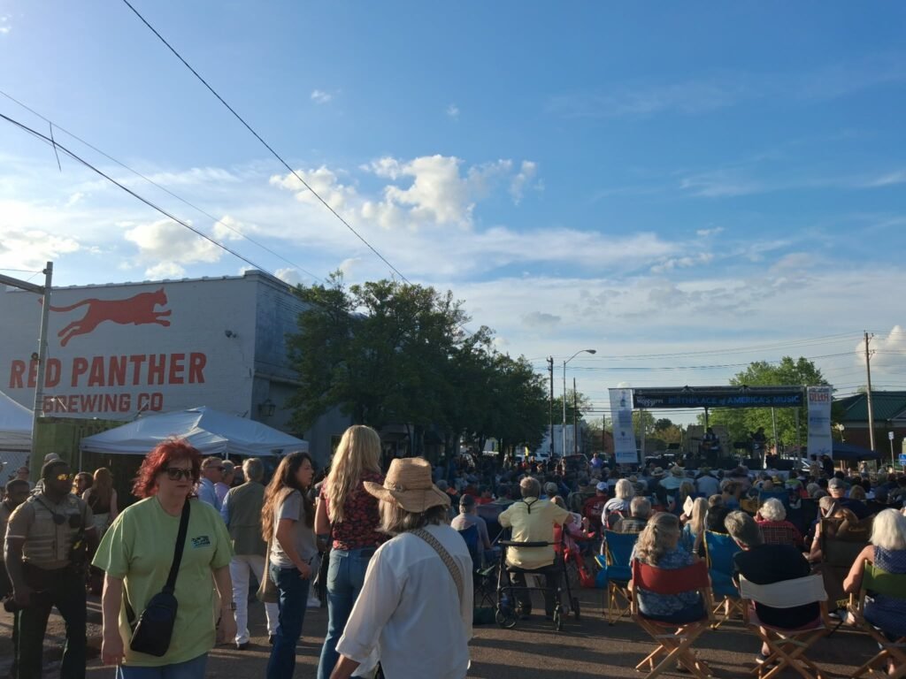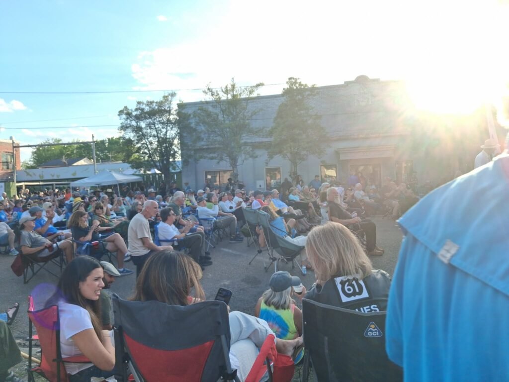 A live audience gathered in a stage setup between the Carnegie Library and Red Panther Brewing Company, as the evening sun cast warm shadows across the concrete. The humid Delta breeze mingled the scents of smoked barbecue, sweat, and the deep aroma of the brewery’s ongoing creations.