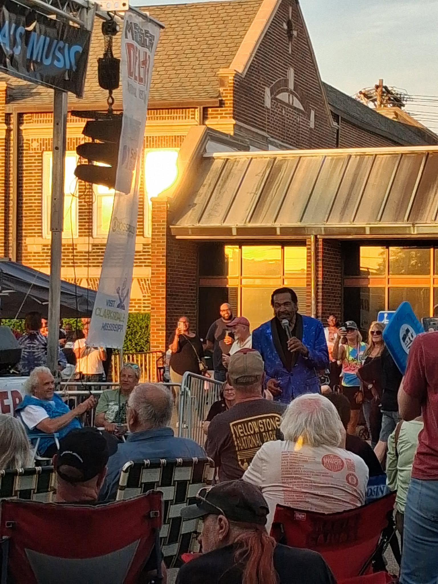 A live audience gathered in a stage setup between the Carnegie Library and Red Panther Brewing Company, as the evening sun cast warm shadows across the concrete. The humid Delta breeze mingled the scents of smoked barbecue, sweat, and the deep aroma of the brewery’s ongoing creations.
