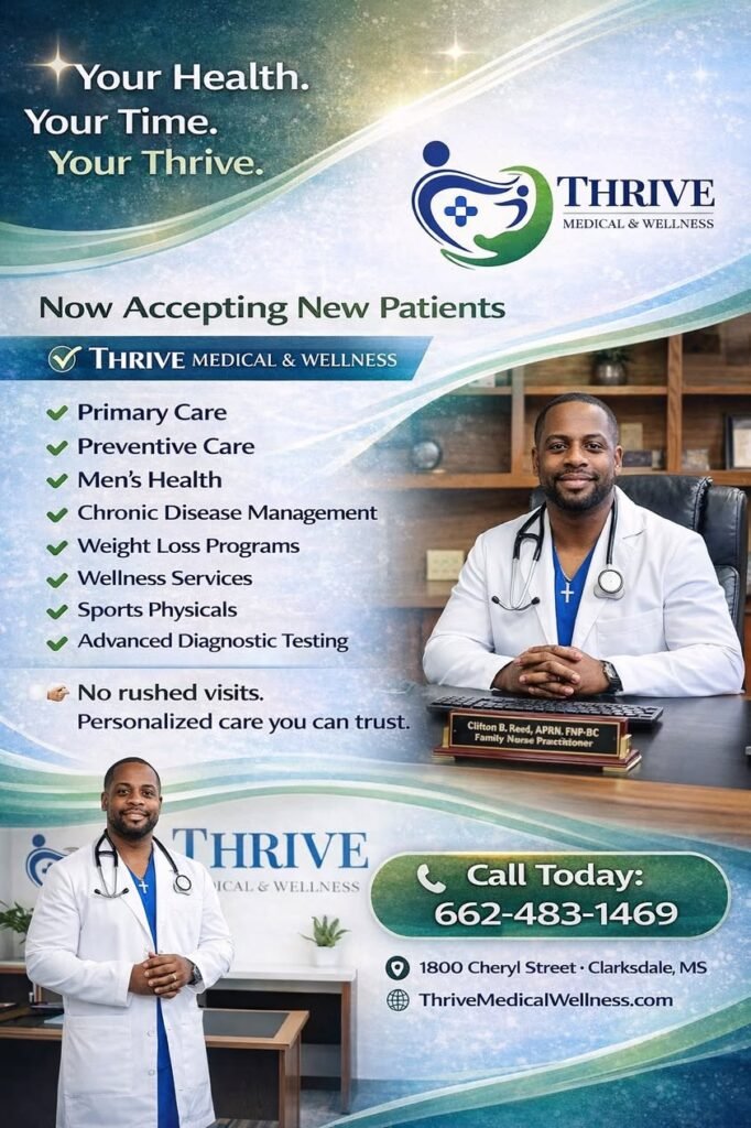 Clarksdale, MS — In a healthcare landscape where many patients often feel rushed through appointments and overlooked, one local provider is changing the experience entirely. Thrive Medical & Wellness, located at 1800 Cheryl Street, is bringing a refreshing, patient-first approach to care—one built on time, trust, and personalized attention.