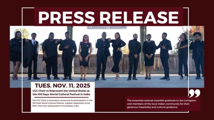 Clarksdale, Mississippi– The CCC Choir is honored to announce its participation in the 100 Days World Cultural Festival, a global celebration of art, faith, and unity taking place in Karnataka, India. The choir will present its original production, “The African American Story: Sung in a Foreign Land,” on November 14 during USA Day at Premamrutham Hall on the campus of Sathya Sai Grama in Muddenahalli, before an anticipated audience of over 5,000 attendees.