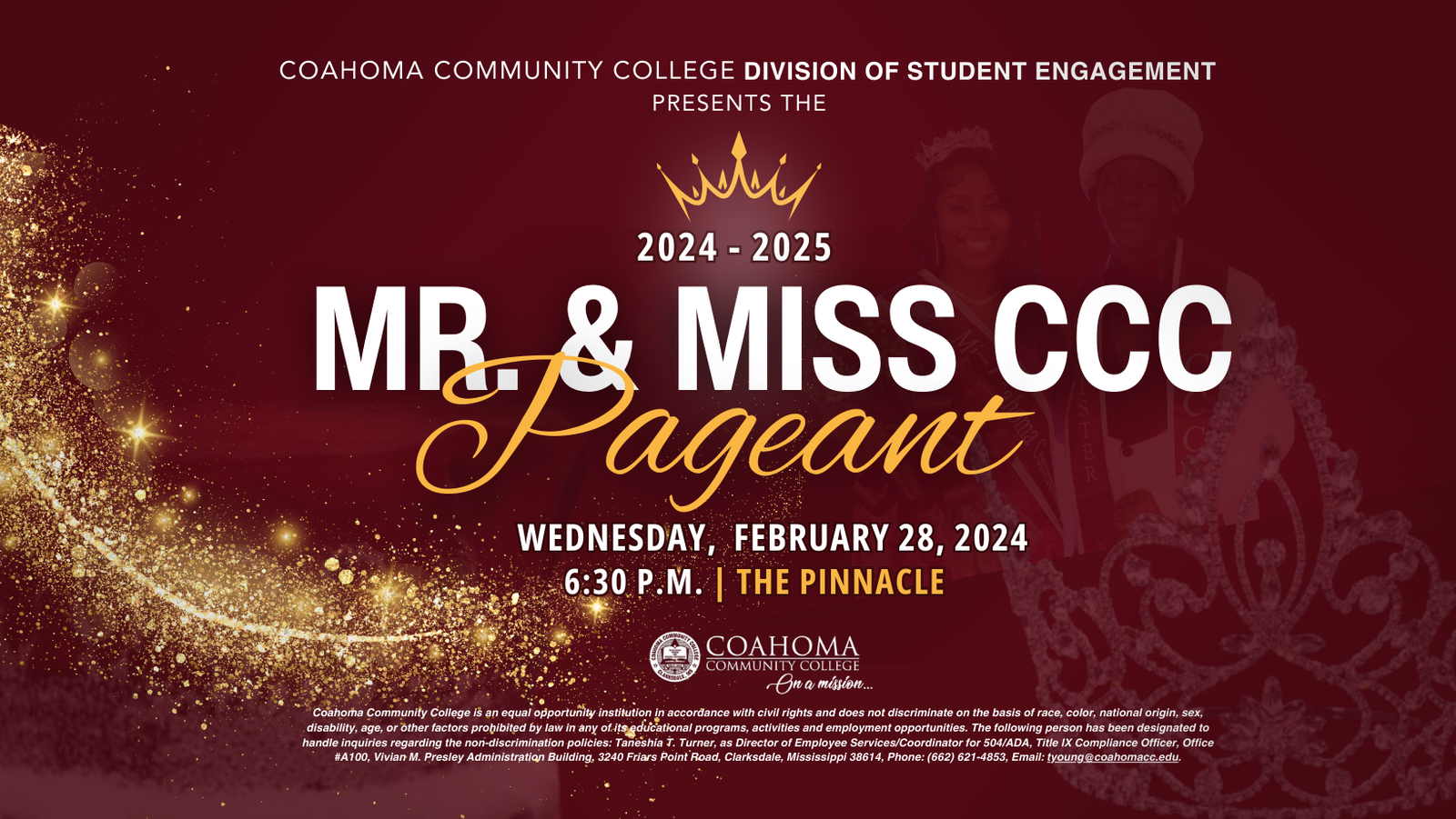 Clarksdale, Mississippi – Coahoma Community College is gearing up to host the annual Mr. and Miss Coahoma Community College Competition on Wednesday, February 28, at 6:30 p.m. in the Pinnacle. Admission is free for the public.