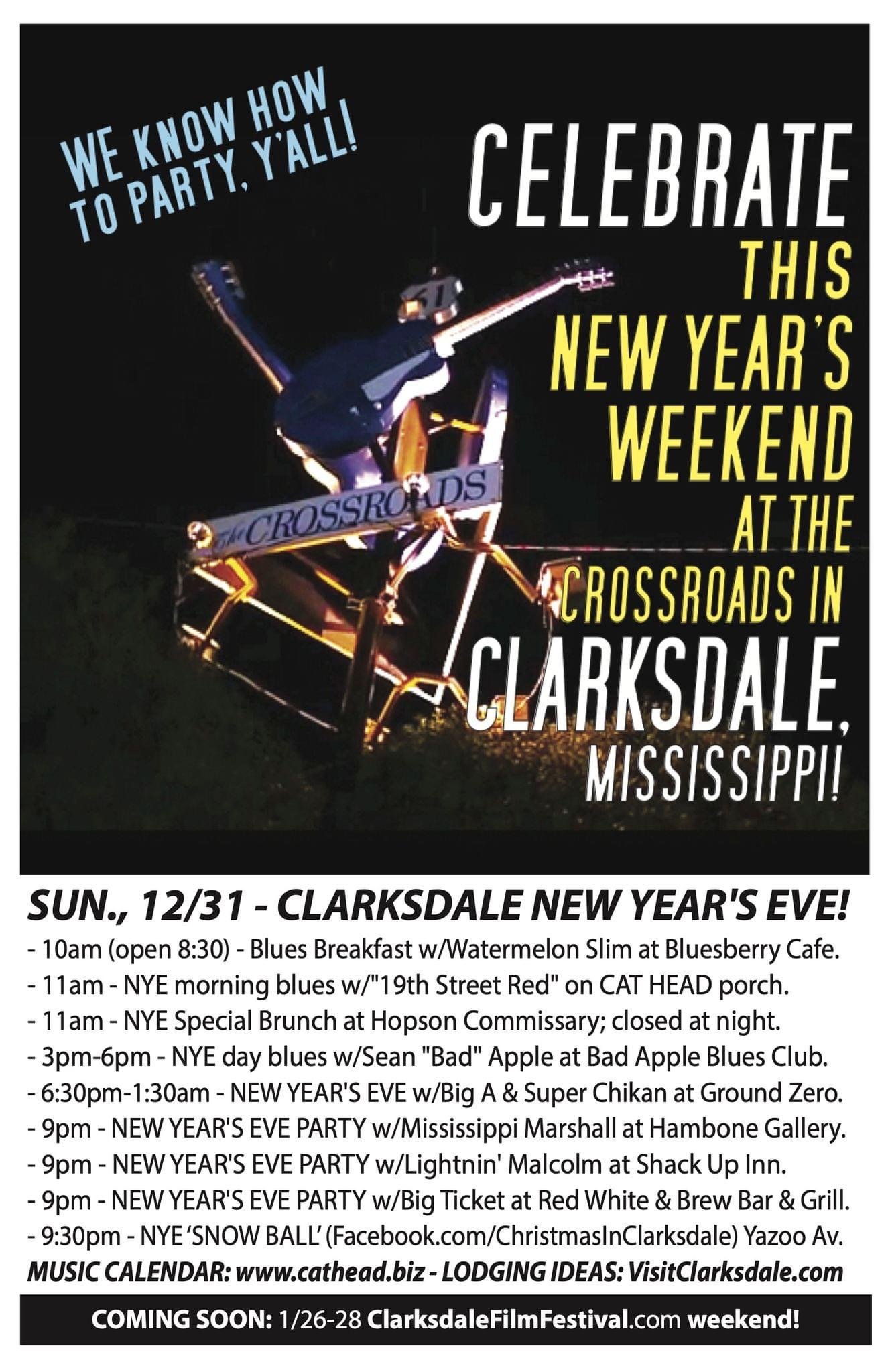NYE ‘Snow Ball’ on Yazoo Avenue For those looking to dance the night away, don’t miss the NYE ‘Snow Ball’ on Yazoo Avenue. Check out the details on Facebook.com/ChristmasInClarksdale and join the festivities starting at 9:30 pm.