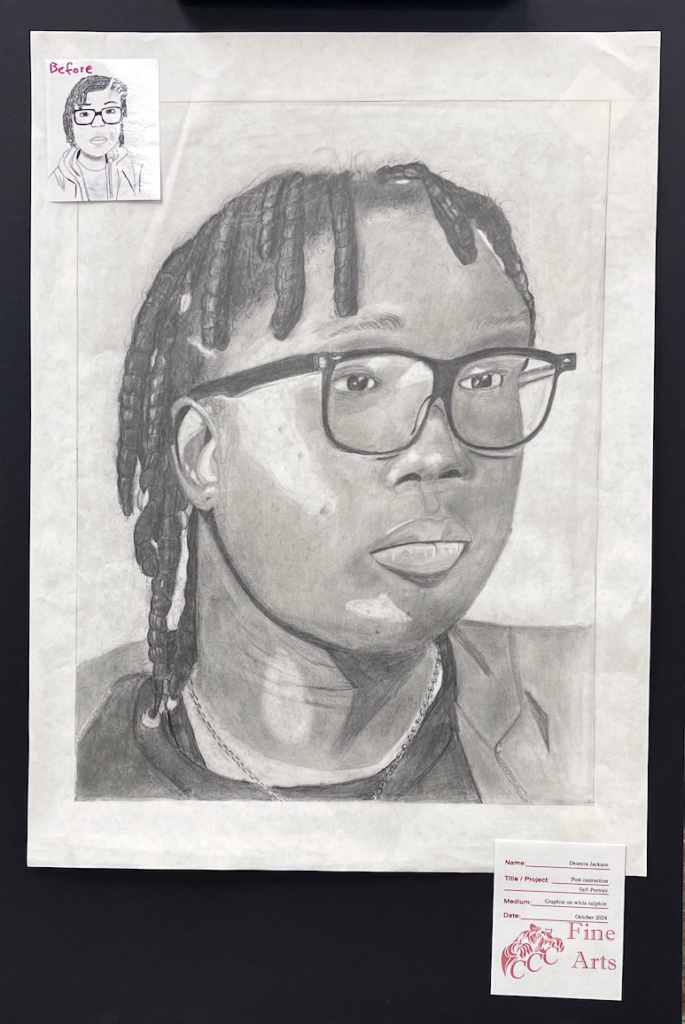 This exhibition highlights a collection of unique artworks created by CCC students across various backgrounds and fields of study. Students in Drawing I start with a foundational self-portrait, using only a mirror as their guide. This initial work captures each student’s starting skill level, offering a basis for comparison with their later self-portraits, which reflect the perceptive drawing skills they develop over the course. The “before” and “after” portraits illustrate the impressive progression that students experience.