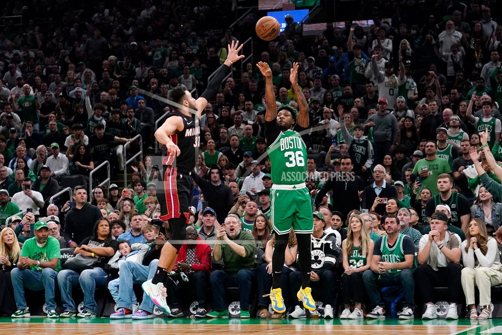 Cover Photo: Boston Celtics guard Marcus Smart, right, shoots as Miami Heat guard Max Strus defends during the first half in Game 5 of the NBA basketball Eastern Conference finals series Thursday, May 25, 2023, in Boston. (AP Photo/Charles Krupa )