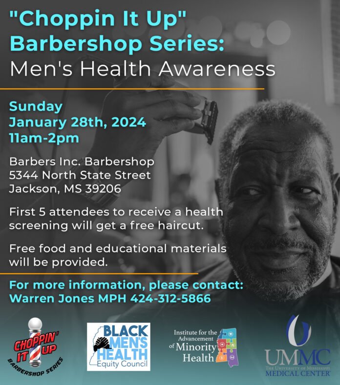 Jackson, MS (January 21, 2024) – The Choppin’ It Up Barbershop Series: A Black Men’s Health Awareness Event is scheduled for Sunday, January 28, 2024, from 11 a.m.-2 p.m. at Barbers, Inc., Barbershop, located at 5344 North State Street, Jackson, MS.