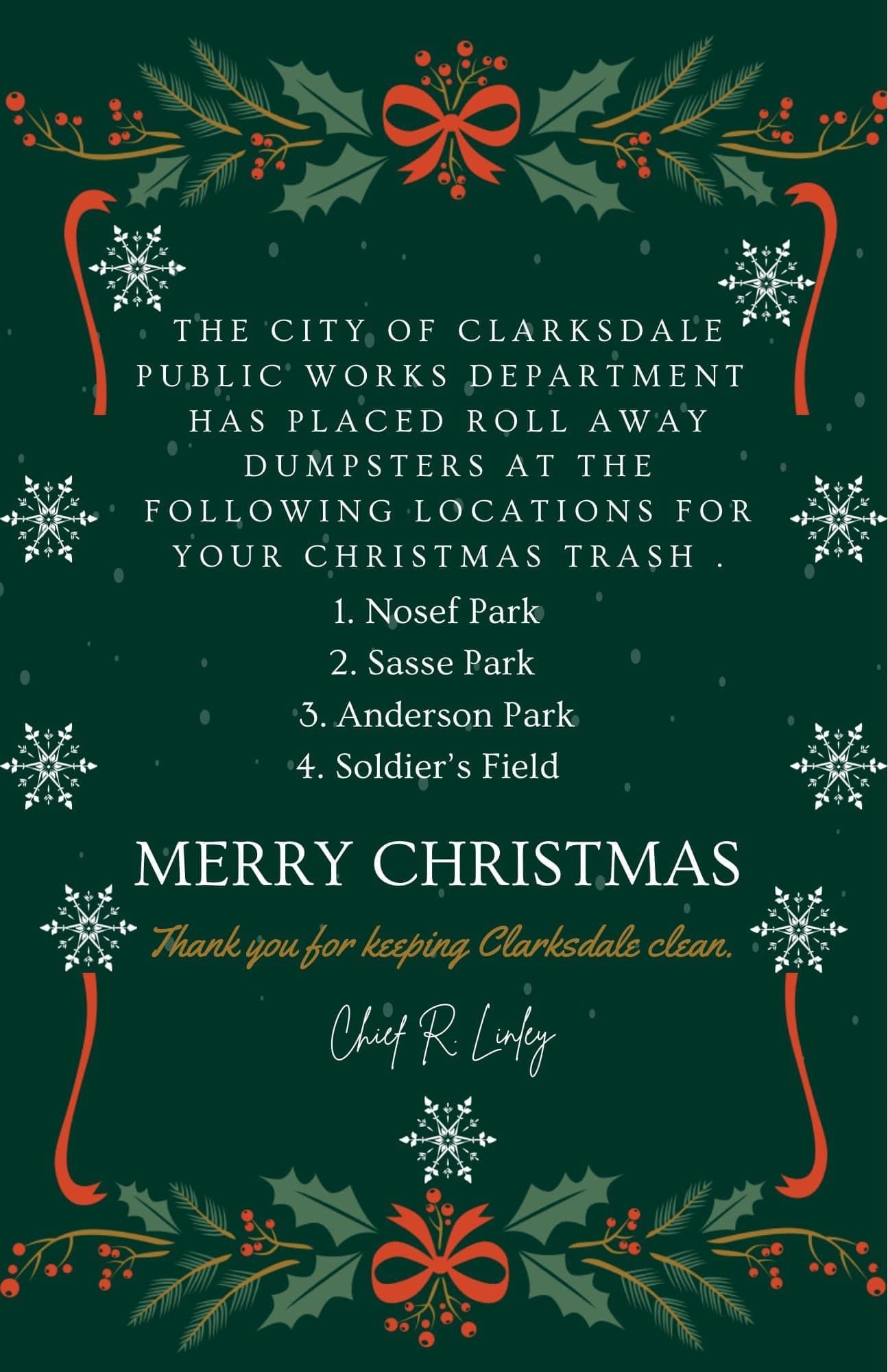 The initiative is a thoughtful gesture to make it easier for residents to dispose of their Christmas trash properly. By strategically placing dumpsters in popular public areas, the Public Works Department aims to encourage everyone to contribute to a cleaner and more beautiful Clarksdale during the holiday season.