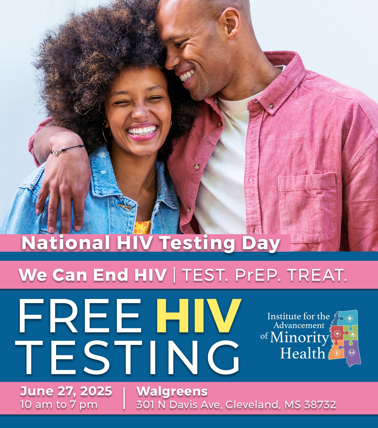 (Jackson, MS) June 13, 2025 National HIV Testing Day is Friday, June 27, 2025.  The Institute for the Advancement of Minority Health, in partnership with Walgreens, will provide free HIV and STI testing for residents of Cleveland and surrounding communities.  Testing will be available from 10 a.m. to 7 p.m. at Walgreens, located at 301 N. Davis Avenue, Cleveland, MS.  Individuals who complete an HIV test will receive a $25 gift card.  Free HIV self-test kits will be available for those who prefer to test at home.