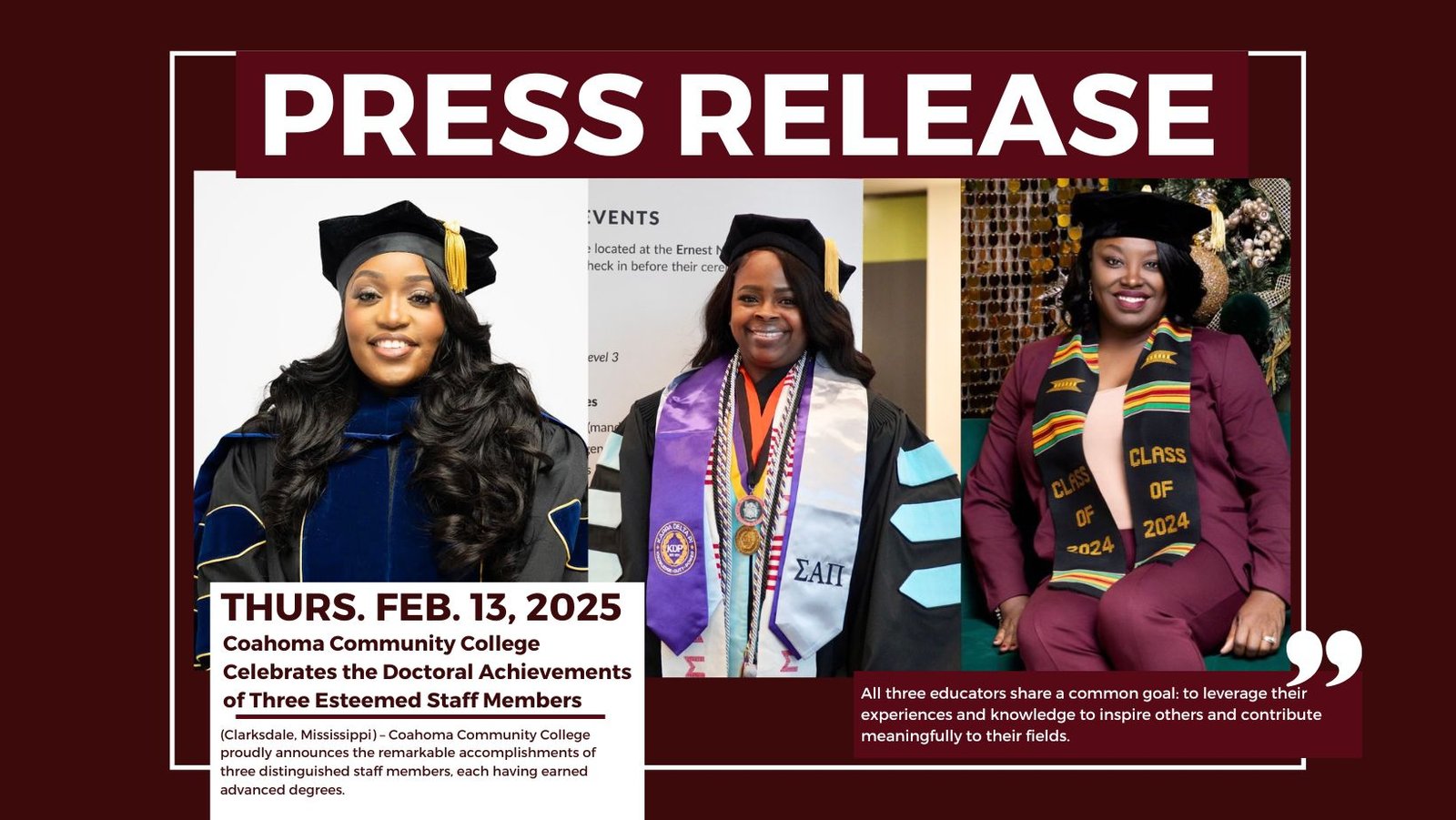 (Clarksdale, Mississippi) – Coahoma Community College proudly announces the remarkable accomplishments of three distinguished staff members, each having earned advanced degrees. Dr. Alexus G. Hunter, Dr. Nekedra Blockett, and Dr. Tolernisa Butler have not only advanced their own academic pursuits but also set a stellar example of dedication and resilience for the student body and their community.