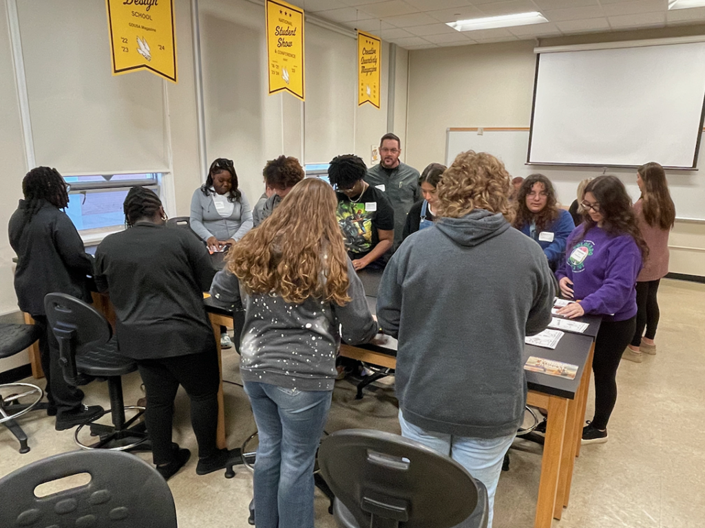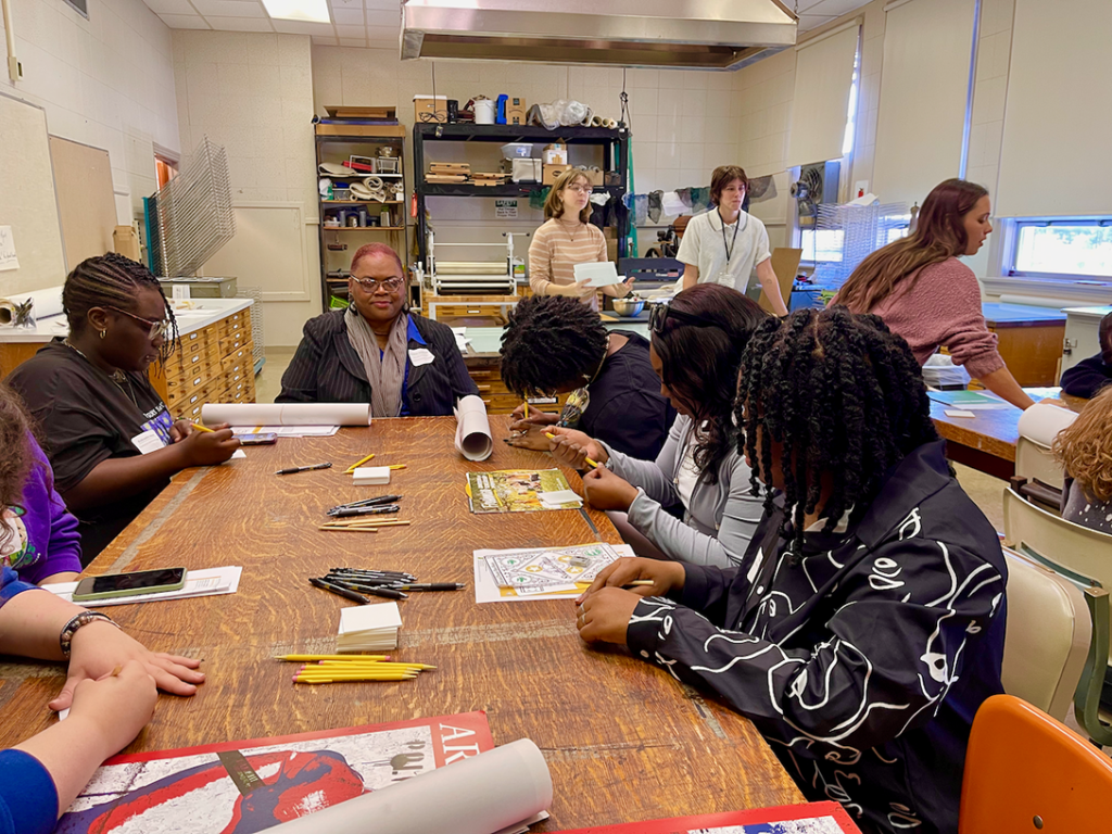 During the visit, students engaged with USM faculty and peers, experiencing the department’s vibrant environment. They participated in hands-on sessions in design, drawing, and printmaking, along with guided tours and demonstrations at USM’s esteemed 3D Arts facility. The students also explored two concurrent exhibits at USM’s gallery, Southern Miss Ceramics National and Cups of Contemplation. The exhibits, juried by renowned ceramic artists Tom and Elaine Coleman, showcase the expressive possibilities of ceramics in both functional and artistic forms. Students witnessed how the tactile beauty of handmade ceramic pieces can elevate everyday experiences, encouraging moments of reflection and connection.