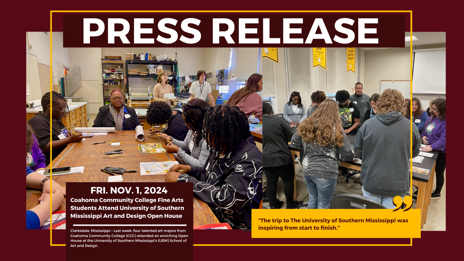 Clarksdale, Mississippi – Last week, four talented art majors from Coahoma Community College (CCC) attended an enriching Open House at the University of Southern Mississippi’s (USM) School of Art and Design. This visit allowed them to explore the potential of furthering their studies in art and design upon completing their program at CCC.