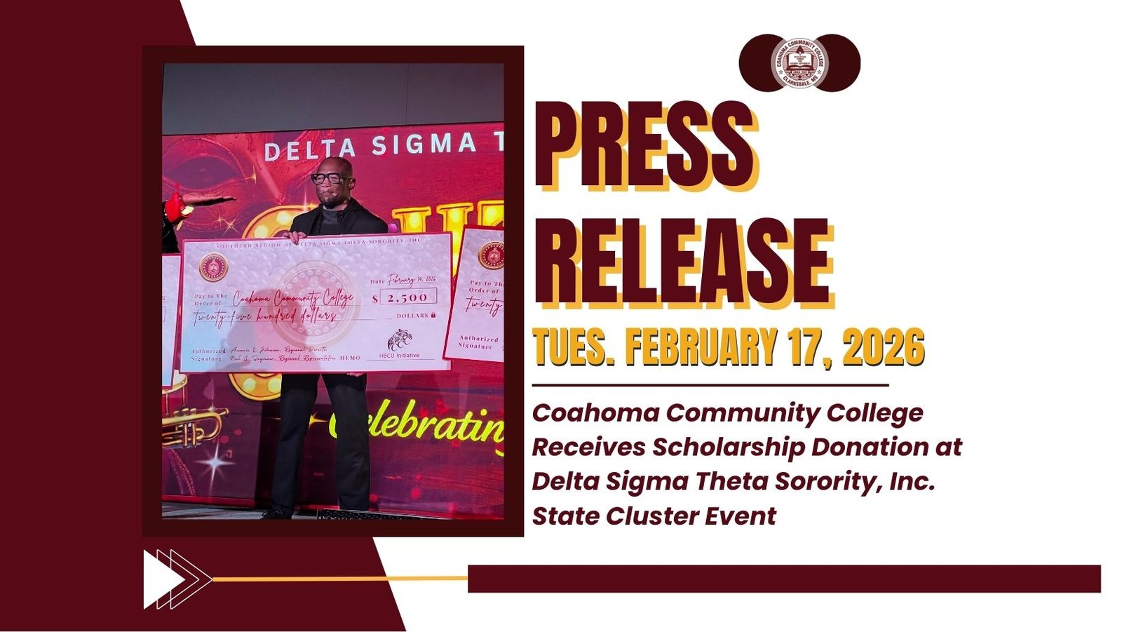 (Jackson, Miss.) — Coahoma Community College is proud to announce that it was selected as one of Mississippi’s seven Historically Black Colleges and Universities (HBCUs) to receive a $2,500 scholarship donation from the Ladies of Delta Sigma Theta Sorority, Inc. during the organization’s recent State Cluster held in Jackson, Mississippi.