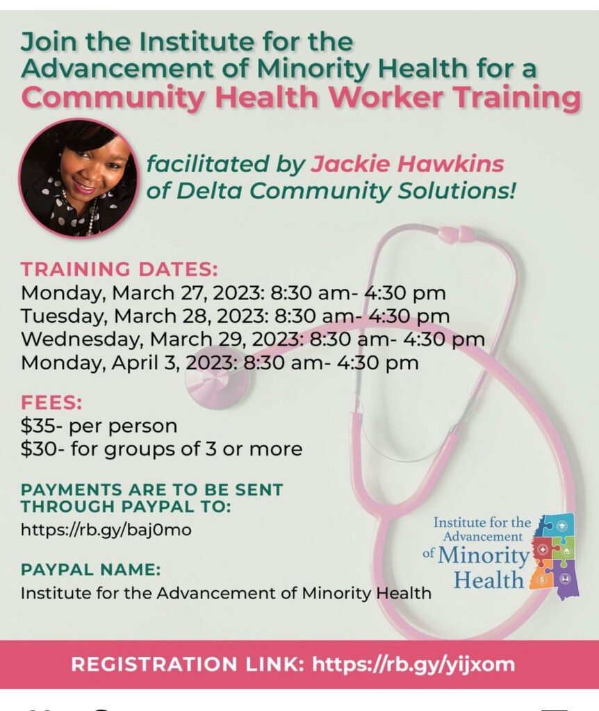 Jackson, MS (March 8, 2023) – The Institute for the Advancement of Minority Health is offering Community Health Worker training.