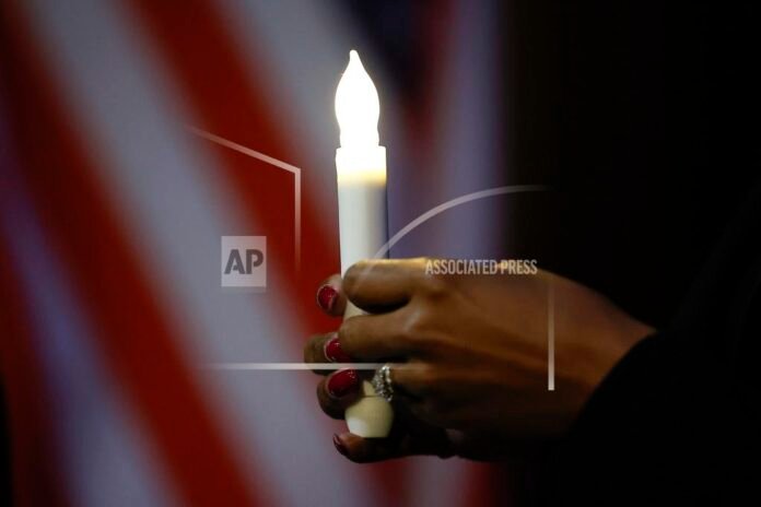 A mourner holds a candle before a memorial service for Dexter Scott King on Saturday, Feb. 10, 2024, in Atlanta. King died on Jan. 22, after battling prostate cancer. (AP Photo/Alex Slitz)
