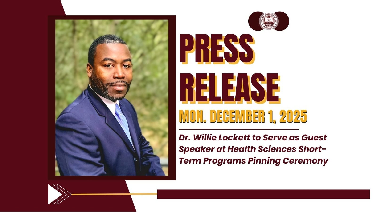 Clarksdale, Mississippi– Coahoma Community College is proud to announce that Dr. Willie Lockett, Jr., Director of Respiratory Care at Coahoma Community College, will serve as the guest speaker at the Short-Term Programs Pinning Ceremony scheduled for Tuesday, December 2, 2025, at 5:00 PM at The Pinnacle.