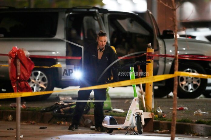 The gunfire broke out in downtown Denver’s LoDo district, which is known for its restaurants and nightlife. Yellow police tape had sealed off the area overnight Tuesday as investigators with flashlights scoured the scene, which was dotted with evidence markers and what appeared to be detritus left over from the celebrations, including an e-scooter and a green rental bike.