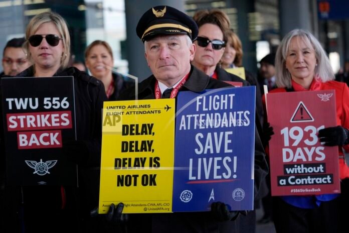 Flight attendants and a pilot protest at O'Hare International Airport in Chicago, Tuesday, Feb. 13, 2024. Three separate unions representing flight attendants at major U.S. airlines are picketing and holding rallies at 30 airports on Tuesday as they push for new contracts and higher wages. (AP Photo/Nam Y. Huh)