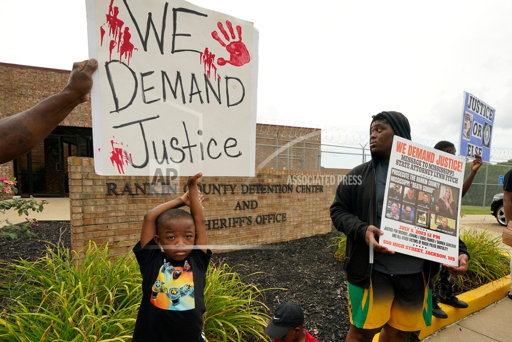 Cover Photo: An anti-police brutality activist looks back at the entrance to the Rankin County Sheriff’s Office in Brandon, Miss., Wednesday, July 5, 2023, as the group called for the termination and prosecution of Rankin County Sheriff Bryan Bailey for running a law enforcement department that allegedly terrorizes and brutalizes minorities. Six former Mississippi law officers, including some who call themselves the “Goon Squad,” will plead guilty to state charges Monday, Aug. 14, for their racist assault on two Black men that ended with an officer shooting one man in the mouth. (AP Photo/Rogelio V. Solis, File)