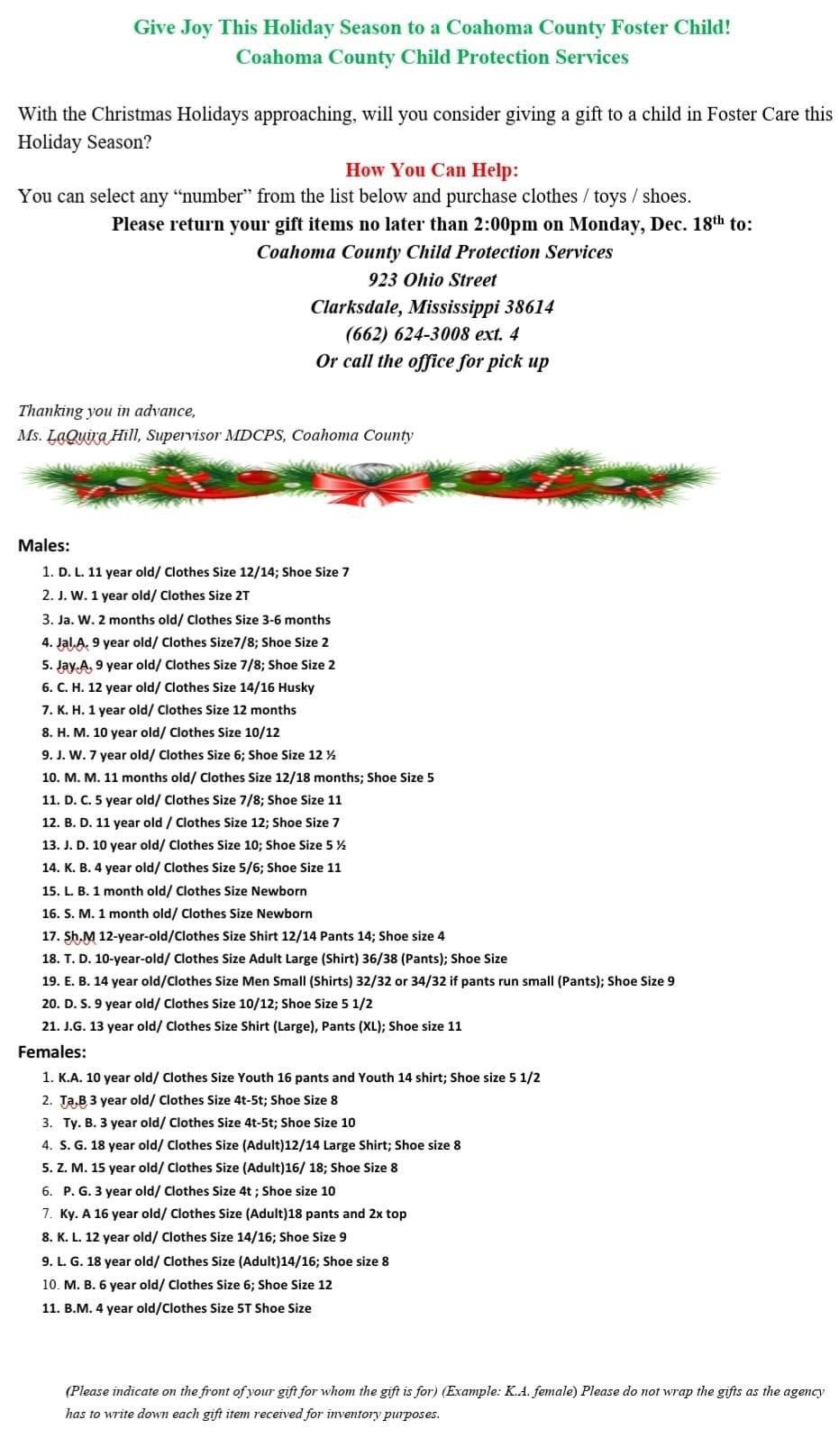 Featured Articles Give Joy to a Coahoma County foster child this holiday season! By Coahoma County Child Protection Service Coahoma County Child Protection Service - December 11, 2023 0 301 FacebookTwitterPinterestWhatsApp