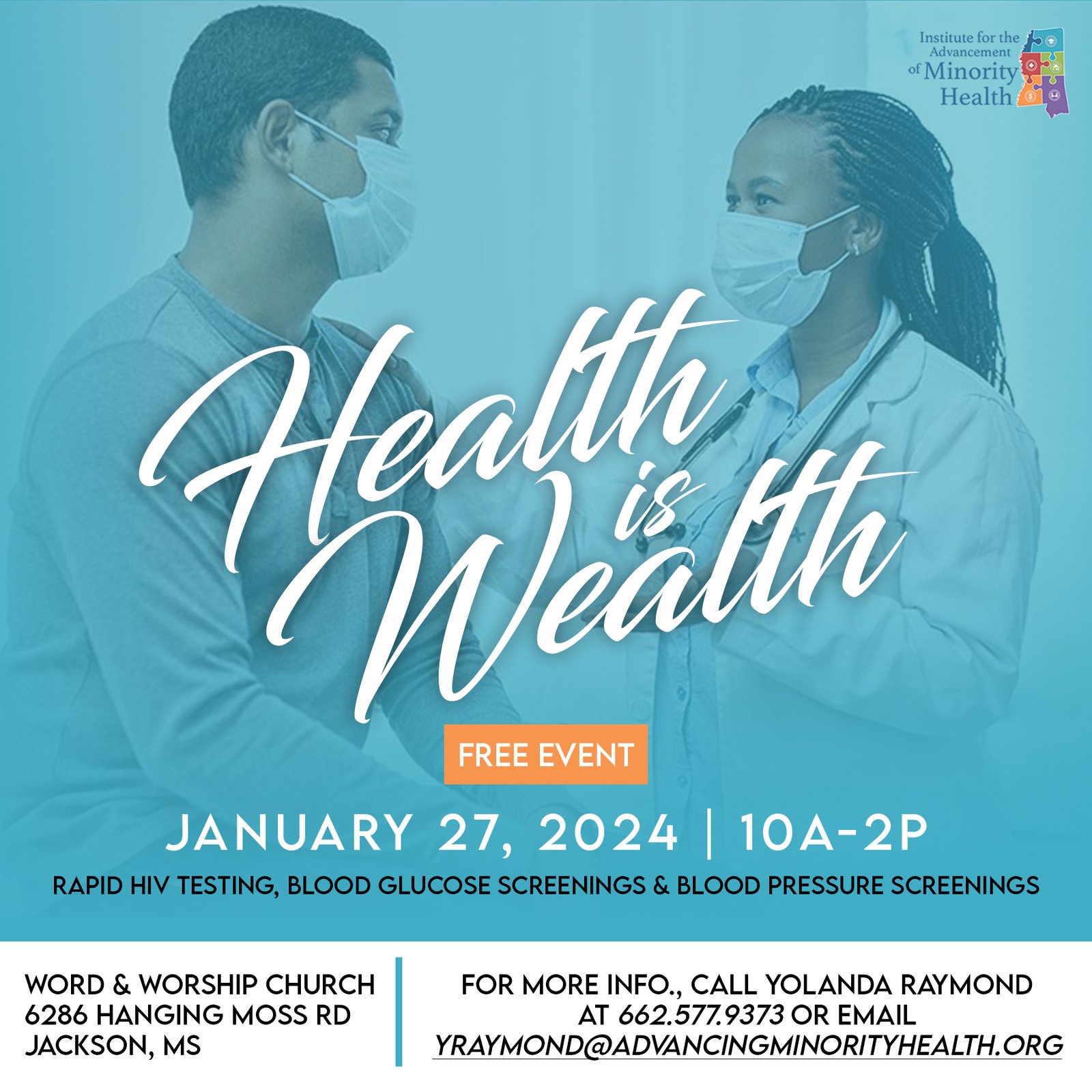 Jackson, MS (January 22, 2024) – If you’ve already deviated from your health resolutions for 2024, the Institute for the Advancement of Minority Health invites you to attend their FREE Health and Wellness Fair. The event will be held at Word and Worship Church from 10 a.m. to 2 p.m. on Saturday, January 27, 2024. Word and Worship islocated at 6286 Hanging Moss Road, Jackson, MS.