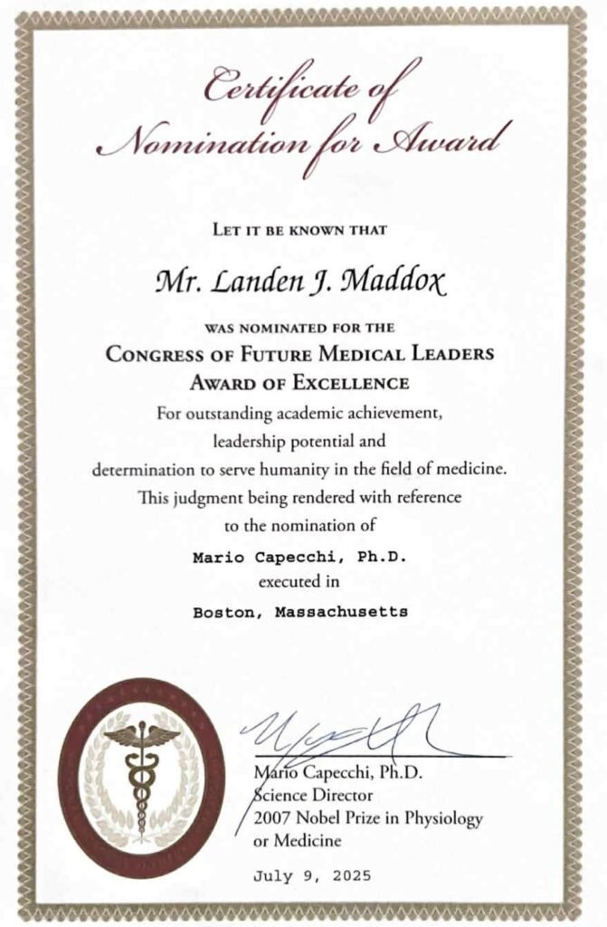 Landen’s nomination was signed by Dr. Mario Capecchi, winner of the Nobel Prize in Medicine and the Science Director of the National Academy of Future Physicians and Medical Scientists. He was selected to represent Mississippi based on his academic achievement, leadership potential, and determination to serve humanity in the field of medicine.
