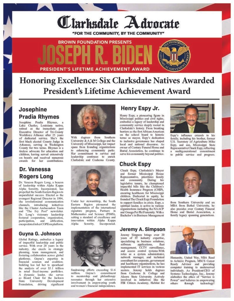 Clarksdale, Mississippi—In a momentous celebration, six remarkable individuals from the Clarksdale community were honored with the prestigious Joseph R. Biden Lifetime Achievement Award. This esteemed award recognizes their dedication and contributions to community service and highlights the significant impact they have made on countless lives both within and beyond their community.