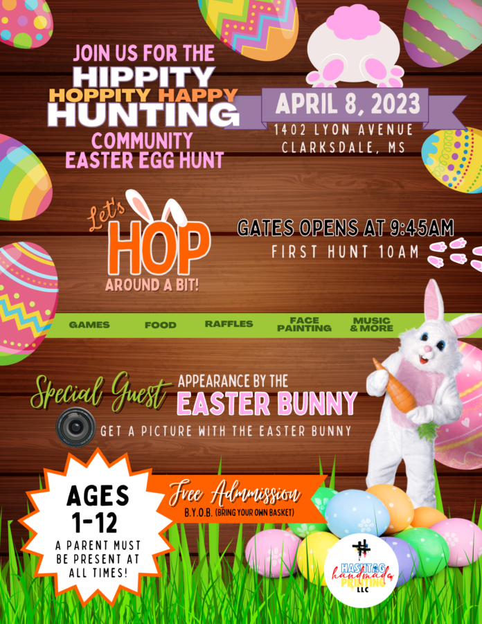 The Hippity Hoppity Happy Hunting event is a free event designed to help bring back the “good outside days” to the many beautiful children in Clarksdale and the surrounding areas and bring the community together for a day of pure fun for everyone.