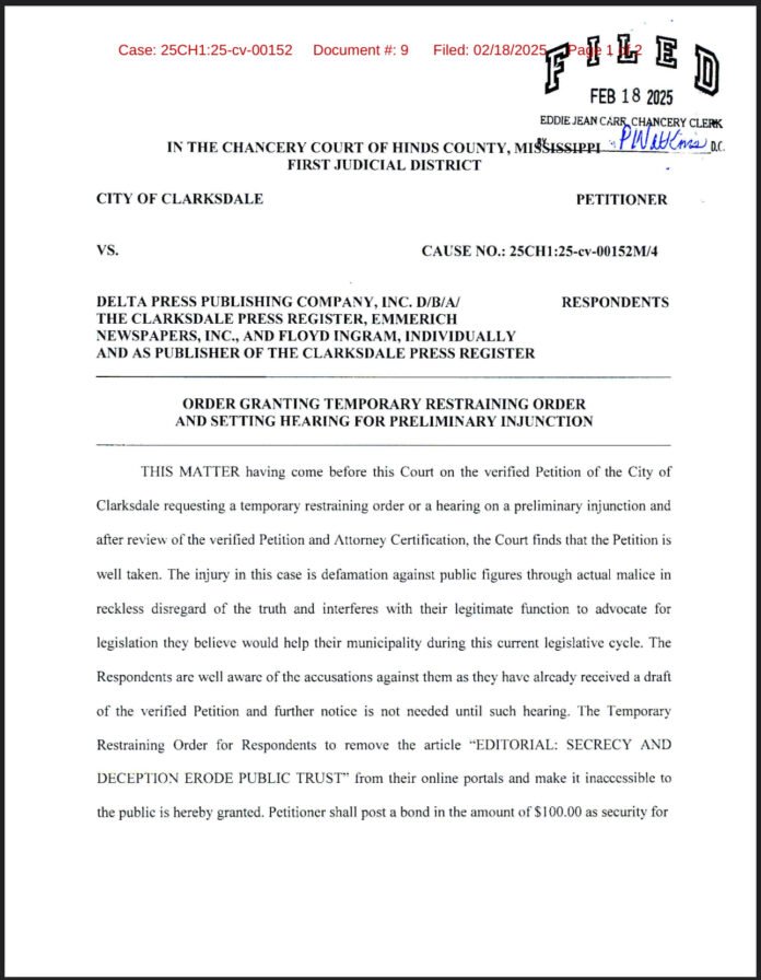 Clarksdale, MS – The City of Clarksdale has been granted a temporary restraining order (TRO) by the Chancery Court of Hinds County, Mississippi, against Delta Press Publishing Company, Inc. (operating as the Clarksdale Press Register), Emmerich Newspapers, Inc., and Floyd Ingram, the newspaper’s publisher. The order, issued by Chancellor Crystal Wise Martin, mandates the immediate removal of an editorial titled “Editorial: Secrecy and Deception Erode Public Trust” from the newspaper’s online platforms.