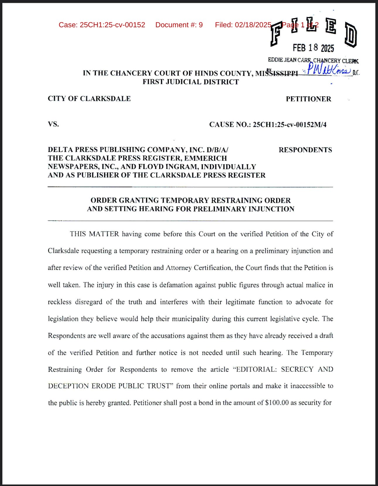 Judge Grants City of Clarksdale Temporary Restraining Order, Sets Hearing Against Clarksdale Press Register, Emmerich Newspapers, Inc., and Floyd Ingram