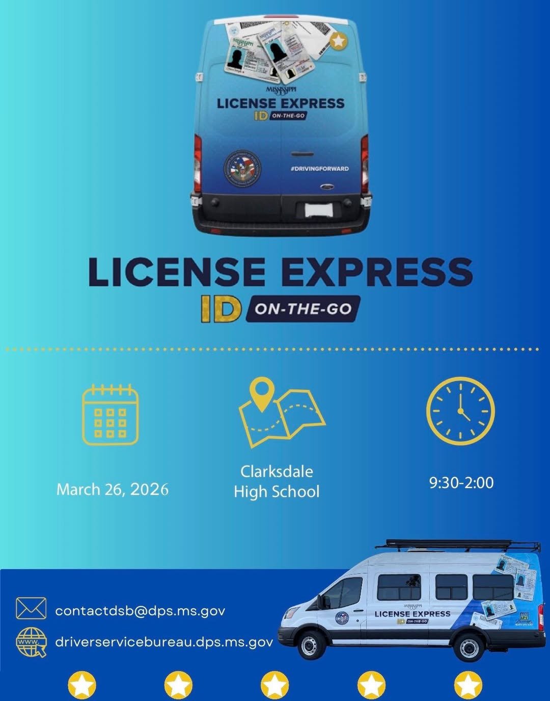 The mobile unit will be stationed at Clarksdale High School on March 26, 2026, operating from 9:30 a.m. to 2:00 p.m., offering driver service assistance directly on campus.