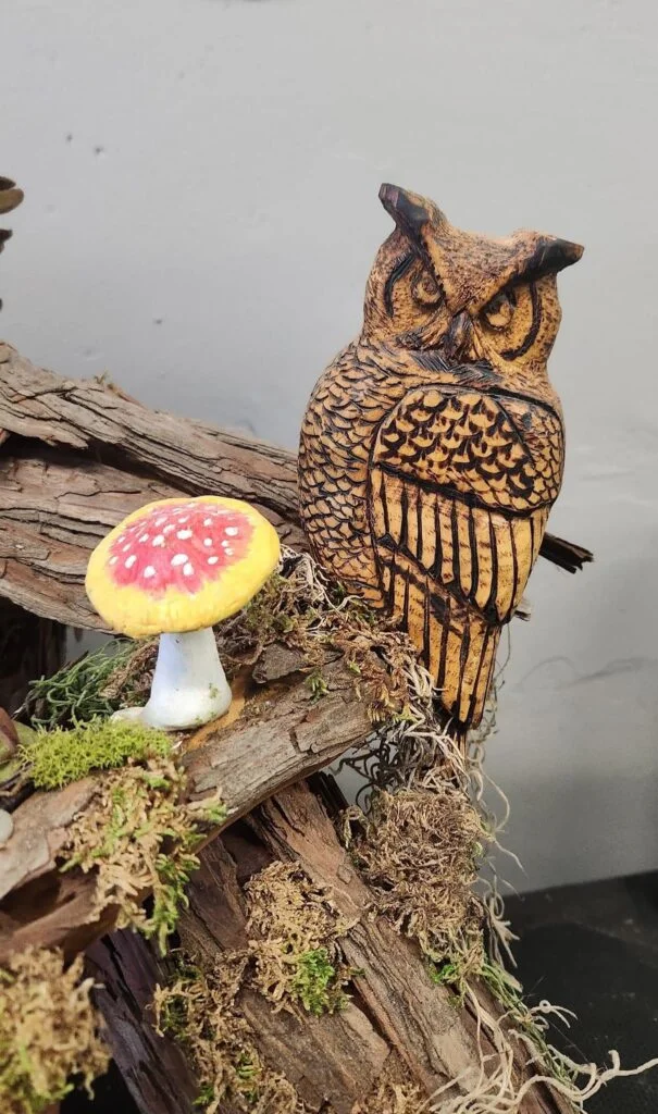 He started wood burning when he was 16, just line drawing. He worked at Delta Wire here in town, and then when the ice storm came in ’94, he started doing tree work. For years, he did tree work for the head of the Harvest Society, Jim Auburn, Northeast tree service out of Madison, Mississippi. He then subcontracted for himself until Hurricane Katrina hit. After that, Weems said the reality shows started coming out, and he started watching the chainsaw carving show and figured he could do that. Weems said, “I just started trying it, and really, nobody showed me. I just picked it up and went to doing it and been doing it ever since.”