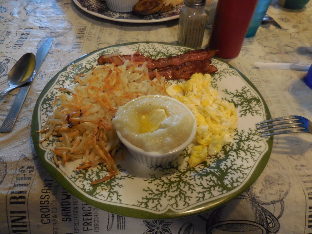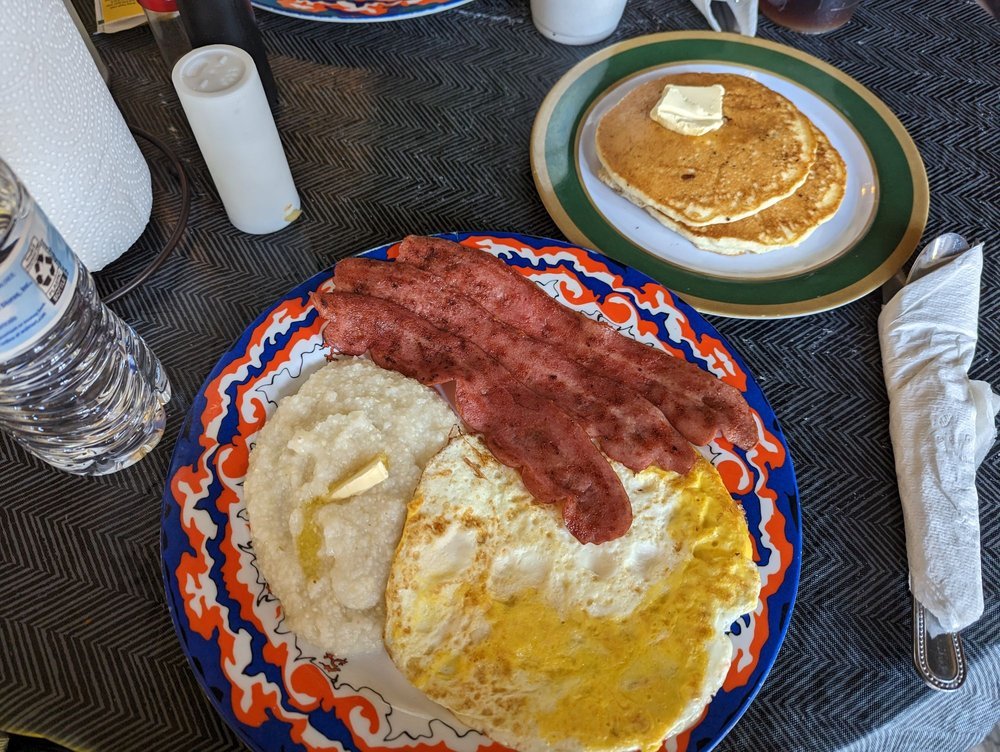 - Breakfast #1 – A full Southern breakfast in one plate: eggs your way, thick bacon or sausage, creamy grits, and pancakes.