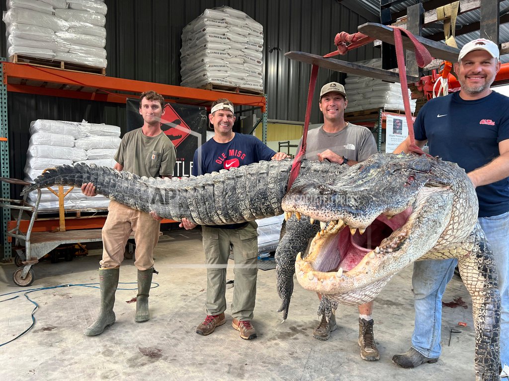 Cover Photo: This photo provided by Red Antler Processing shows the alligator sport hunting team made up of, from left, Tanner White, tag-holder Donald Woods, Will Thomas and Joey Clark as they hoist, with the help of a forklift, the longest alligator officially harvested in Mississippi, Saturday, Aug. 26, 2023, at Red Antler Processing in Yazoo City, Miss. The male alligator weighed 802.5 pounds and measured 14 feet, 3 inches long, and its length broke the state record as the longest alligator ever caught, according to the Mississippi Department of Wildlife, Fisheries and Parks. (Shane Smith/Red Antler Processing via AP)