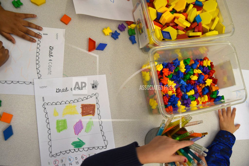Preschool students practice math using manipulatives at a public school in Boston in 2016. Experts say all students, not only those with dyscalculia, could benefit from using manipulatives to help visualize problems and graph paper to assist in lining up numbers. (Lillian Mongeau/The Hechinger Report via AP)