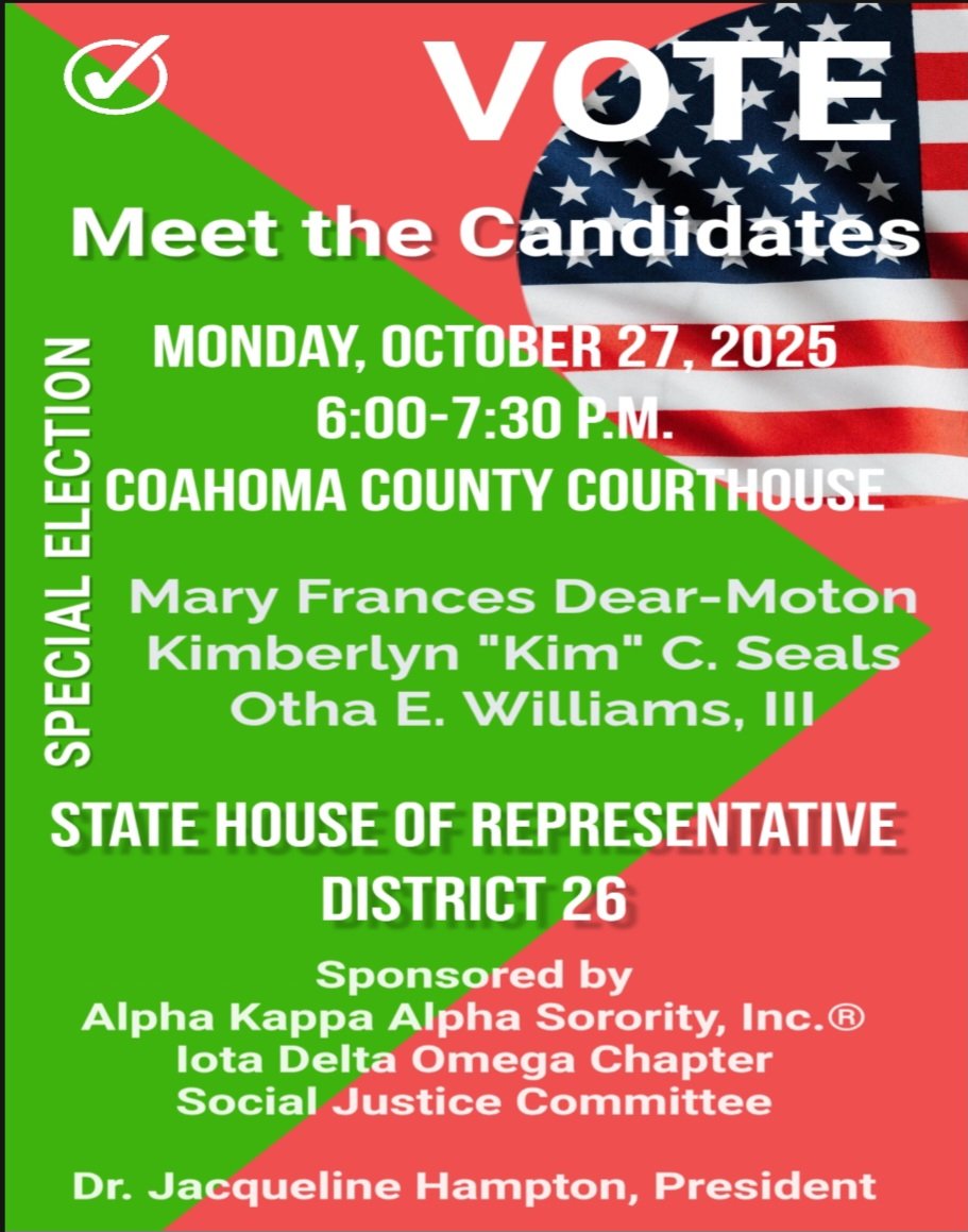 Clarksdale, Mississippi — Coahoma County residents are invited to a “Meet the Candidates” event ahead of the upcoming Special Election for State House of Representatives, District 26. The public forum will take place on Monday, October 27, 2025, from 6:00 to 7:30 p.m. at the Coahoma County Courthouse.