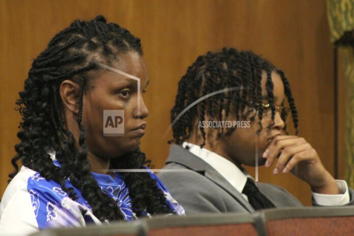 D’Monterrio Gibson, right, and his mother, Sharon McClendon, await the start of the trial of two white men charged in an attack on Gibson, a FedEx employee who was making a delivery, Thursday, Aug. 17, 2023, in Brookhaven, Miss. The judge declared a mistrial of the men who were charged with attempted first-degree murder, conspiracy and shooting into the vehicle driven by Gibson. (Hunter Cloud/The Daily Leader via AP)