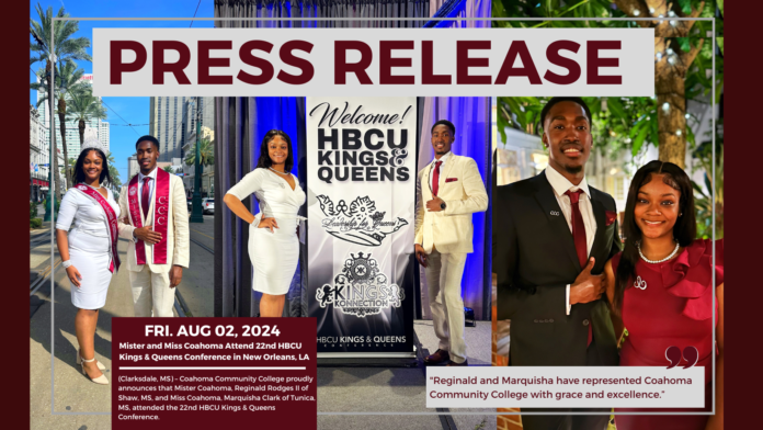 (Clarksdale, MS) – Coahoma Community College proudly announces that Mister Coahoma, Reginald Rodges II of Shaw, MS, and Miss Coahoma, Marquisha Clark of Tunica, MS, attended the 22nd HBCU Kings & Queens Conference. The event was held in New Orleans, LA, from August 1st to August 4th. The conference offered invaluable personal, professional, and academic development opportunities for student leaders.