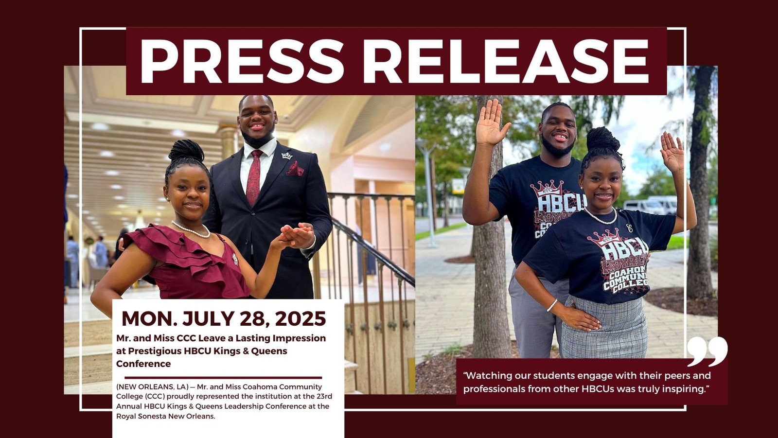 (NEW ORLEANS, LA) — Mr. and Miss Coahoma Community College (CCC) proudly represented the institution at the 23rd Annual HBCU Kings & Queens Leadership Conference at the Royal Sonesta New Orleans. This prestigious four-day gathering united HBCU student leaders from across the country for a series of workshops, networking events, and cultural celebrations designed to strengthen their skills as ambassadors for their institutions.