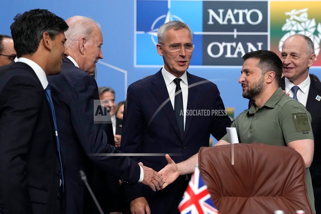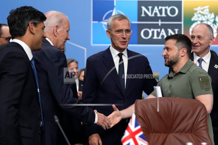 Cover Photo: United States President Joe Biden, second left, shakes hands with Ukraine’s President Volodymyr Zelenskyy during a meeting of the NATO-Ukraine Council during a NATO summit in Vilnius, Lithuania, Wednesday, July 12, 2023. NATO leaders gathered Wednesday to launch a highly symbolic new forum for ties with Ukraine, after committing to provide the country with more military assistance for fighting Russia but only vague assurances of future membership. (AP Photo/Pavel Golovkin)