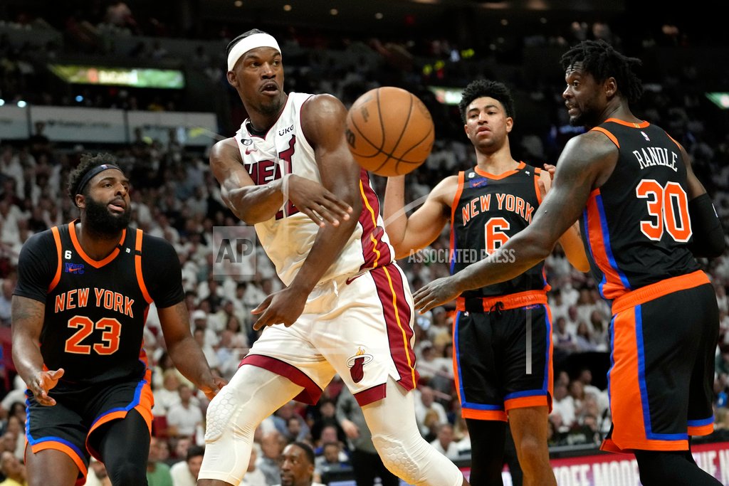 Miami Heat forward Jimmy Butler, second from left, passes the ball as New York Knicks center Mitchell Robinson (23), Quentin Grimes (6) and Julius Randle (30) look on during the second half of Game 4 of the NBA basketball Eastern Conference playoff semifinal, Monday, May 8, 2023, in Miami. (AP Photo/Lynne Sladky)