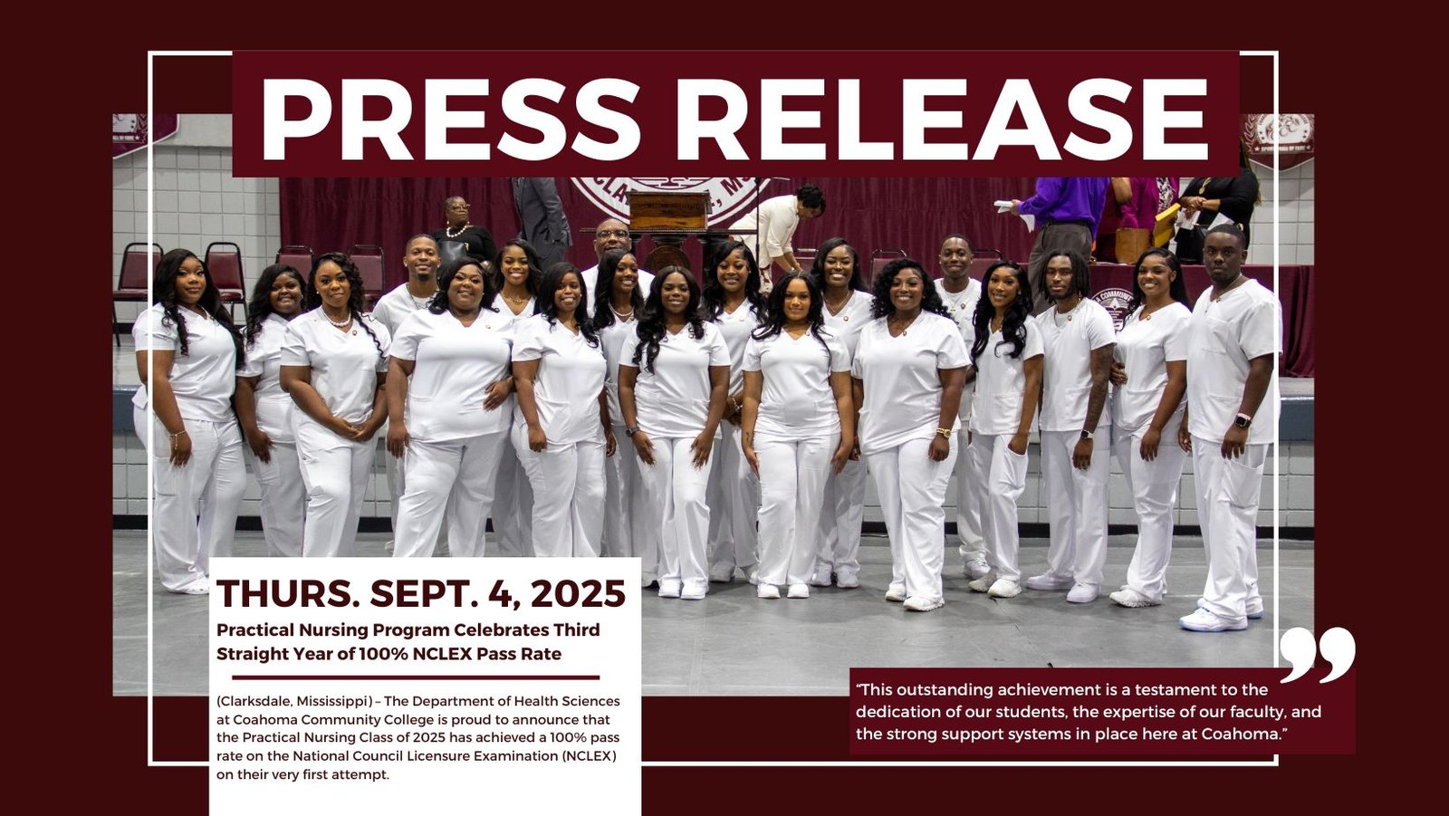 (Clarksdale, Mississippi) – The Department of Health Sciences at Coahoma Community College is proud to announce that the Practical Nursing Class of 2025 has achieved a 100% pass rate on the National Council Licensure Examination (NCLEX) on their very first attempt. This remarkable accomplishment marks the third consecutive year that the Practical Nursing Program has reached this milestone of excellence.